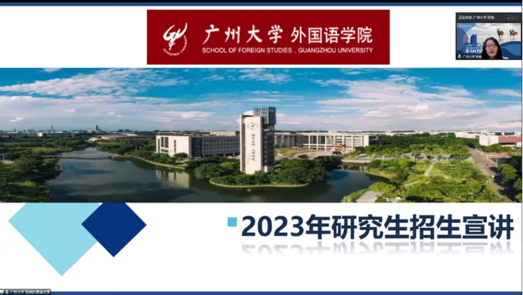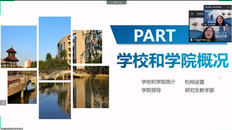 硕士生导师、翻译实践和理论研究的骨干教师——张艳副教授代表学院进行了推介。宣讲伊始,张艳副教授以视频形式,向参会人员介绍了学校及学院的基本情况,随后从学院架构、翻译硕士人才培养模式及特色、研究生奖助体系及学院研究生就业情况等方面进行了展示。