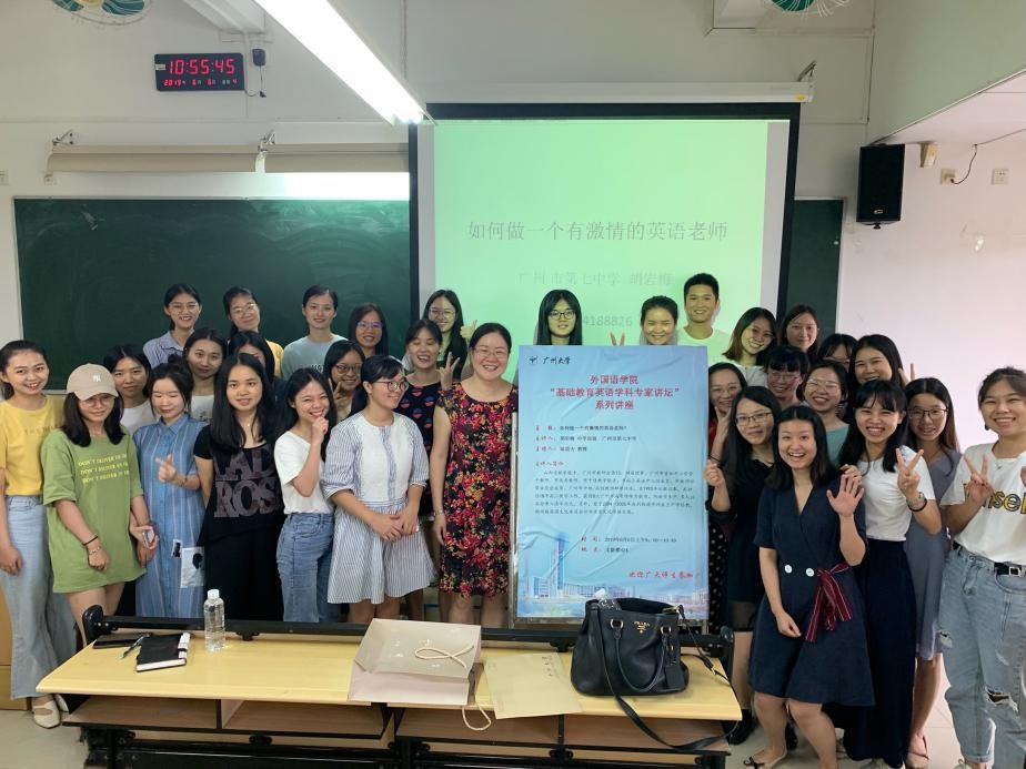 应学院邀请,国家级重点高中广州市第七中学英语科主任、高级教师胡岩梅老师于2019年6月6日上午在文新楼224教室为我院教育硕士做了一场题为“如何成为一个有激情的英语老师”的讲座,讲座由研究生部副主任陆道夫教授主持。