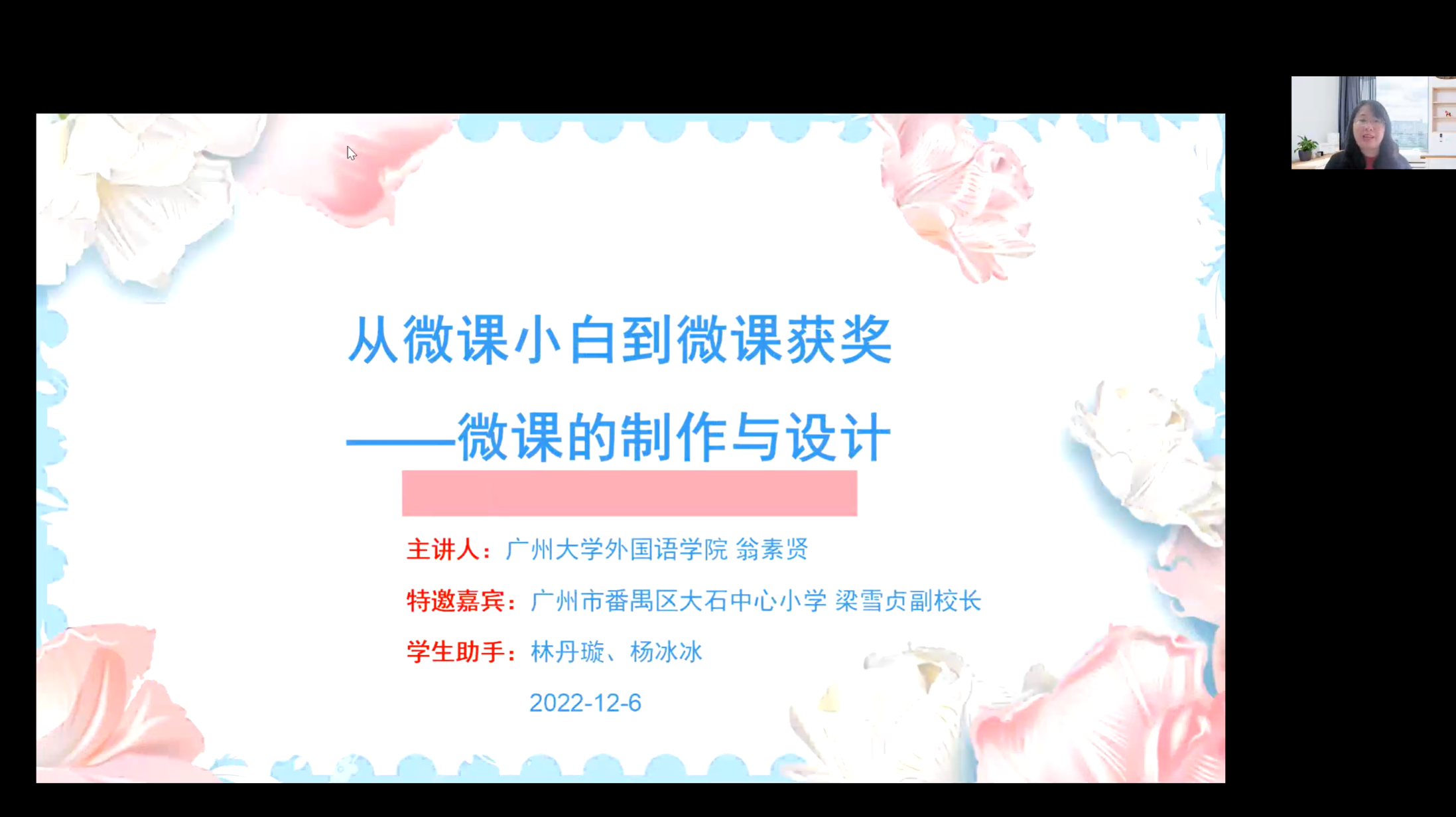12月6日下午,我院研究生部为全体研究生组织了一场信息技术与英语教学融合的专题讲座《从微课小白到微课获奖——微课的制作与设计》,由我院英语系师范教研室翁素贤老师主讲。此次讲座特别邀请广州市番禺区大石中心小学梁雪贞副校长参与分享,以及学生助手英语系196班林丹璇和杨冰冰为同学们示范相关软件的操作。讲座通过腾讯会议进行,吸引了一百多名在读研究生以及部分已经毕业的研究生参与学习。