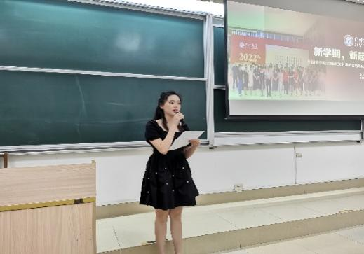 吴静萍同学作为老生代表发言。她首先对新同学的到来表示热烈欢迎,并祝愿师弟师妹们,在人生新征程上不断取得新成绩,在广大外院看见光,追逐光,成为光,用拼搏拥抱流光溢彩的未来,留下一段闪闪发光的奋斗回忆,不虚此行!
