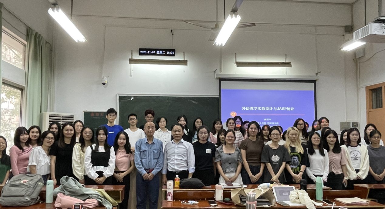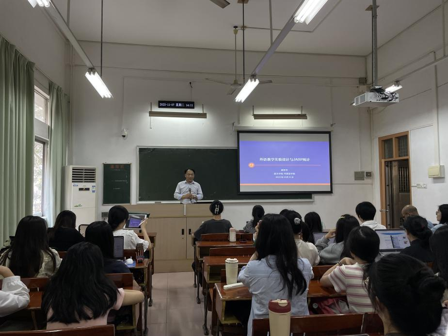 院长阚哲华教授应邀来我院做题为《外语教学实验设计与JASP统计》的学术讲座。讲座由校级督导朱亚夫副教授主持,在校教育硕士全程参与。