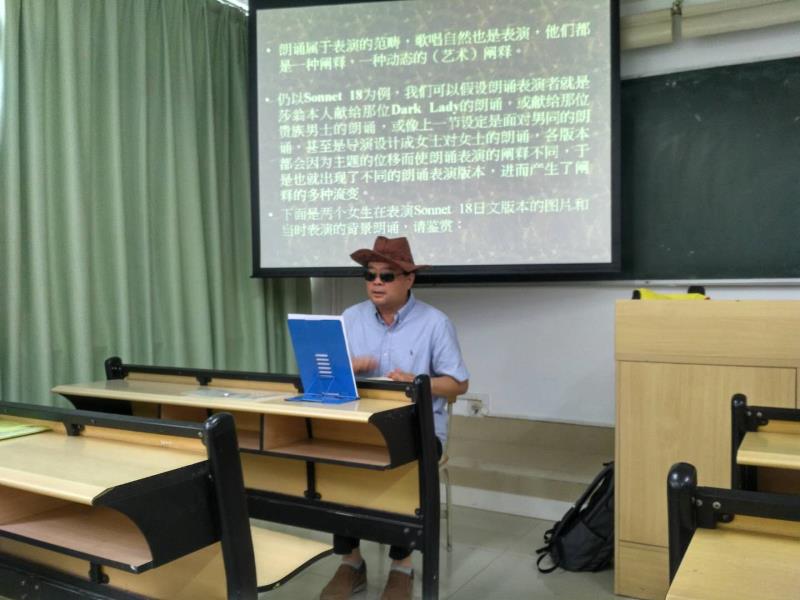 在讲解第一部分“理解、阐释与流变”时,张教授兴致勃勃地吟唱了莎翁的Sonnet 18,通过吟唱表达了自己对Sonnet 18的理解和阐释。在第二部分“表演、阐释与流变”环节中,张教授拿出非洲鼓,为在座师生奉上Sonnet 18的现场rap版本,身体力行地表演、阐释经典。而在第三部分“经典文本的流变”环节中,张教授引用土耳其诗人Qyazzirah Syeikh Ariffin的一首网红经典诗歌“I am afraid”,讲解多种流变的译本,让大家进一步了解、体会经典的阐释与流变。