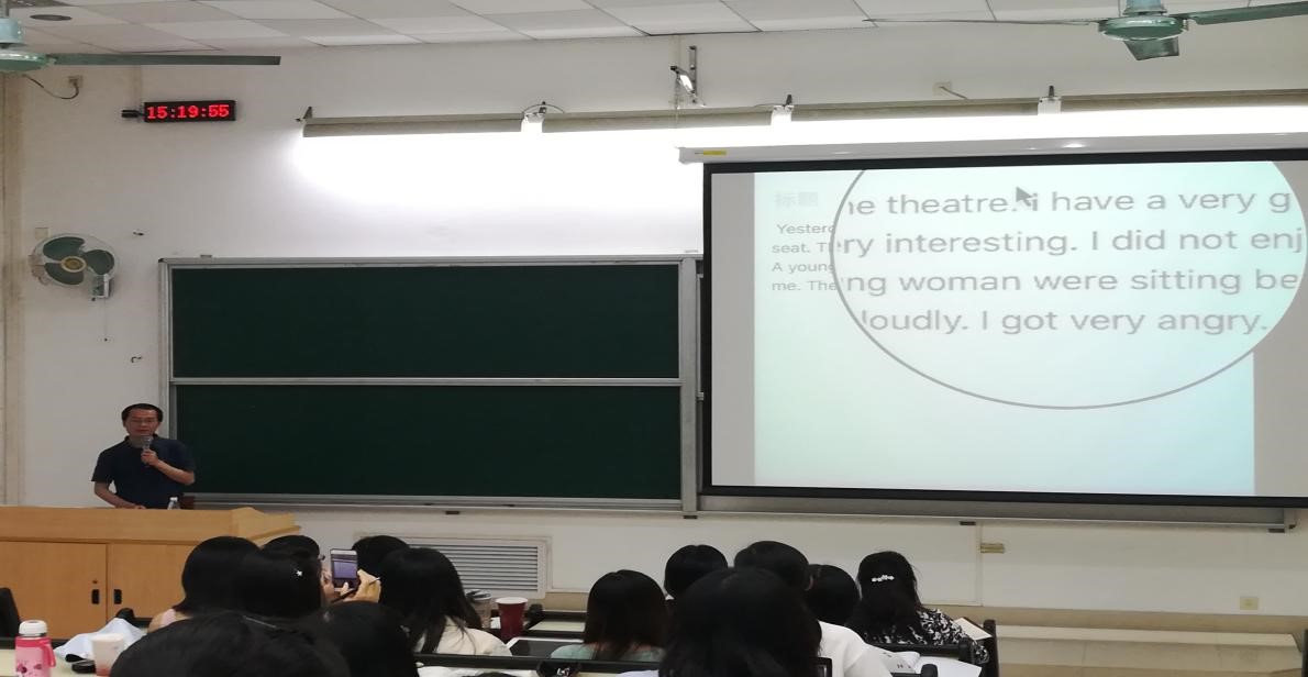 4月23日下午, 华南师范大学外文学院英语系主任刘晓斌副教授为我院师生带来了一场以“核心素养·新技术·听说教学”为主题的精彩讲座。作为华南师范大学外语教育信息化研究中心主任、广东省高等教育学会教育技术专业委员会常务理事,刘老师主持国家级精品在线开放课程及全国首届百门“最美慕课”《英语教学与互联网》,在教育技术方面颇有建树。此次讲座,刘老师从英语学科核心素养要求出发,针对听说教学的实际应用,介绍了如何运用教育技术提高英语听说教学。