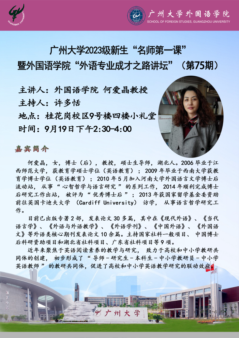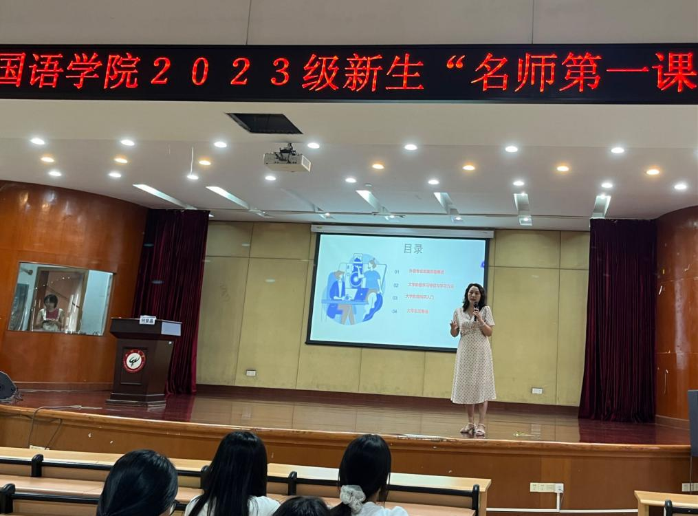 “外语专业成才之路讲坛”。本次讲座特别邀请了学院何爱晶教授以《念念不忘,必有回响:外语专业学生的成长之旅》进行主题讲授,讲座由学院党委副书记许多恬主持,全体2023级新生参加。