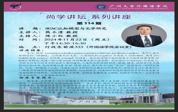 2024年11月22日下午,我院成功举办“尚学讲坛”系列讲座第114期,主题为“5EAC认知模型与文学研究”。本次讲座特别邀请四川外国语大学熊木清教授担任主讲,由陈小红教授主持。西瓜视频