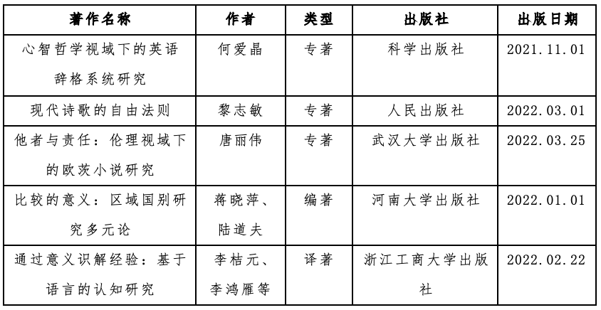我院何爱晶教授、黎志敏教授、唐丽伟副教授分别在科学出版社、人民出版社和武汉大学出版社出版科研著作各1部;蒋晓萍教授和陆道夫教授编著科研著作1部;李桔元教授和李鸿雁教授等翻译科研著作1部。