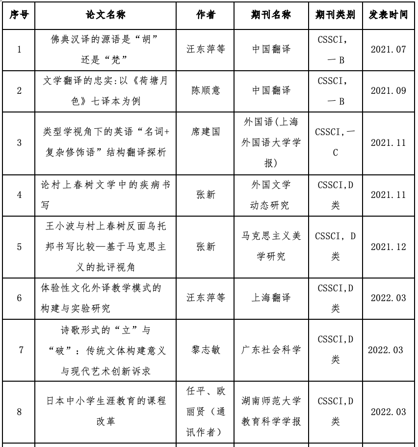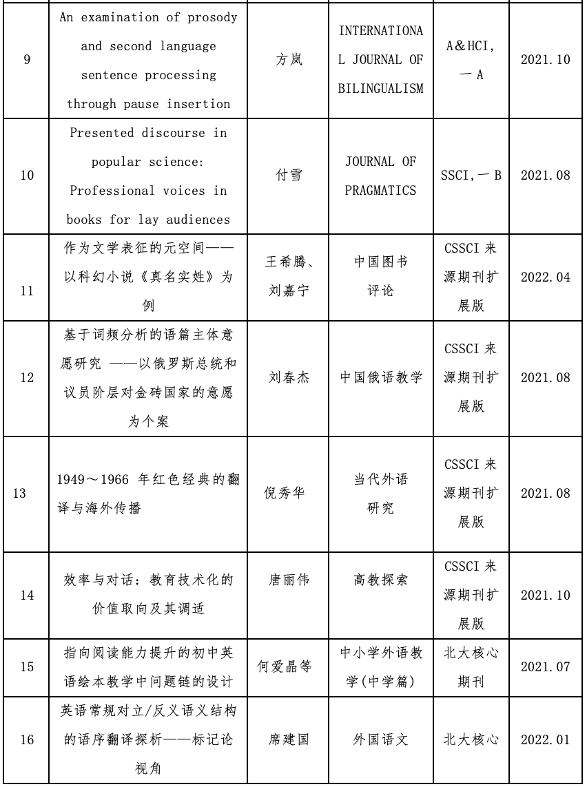 2021-2022学年我院教师发表论文55篇,其中A&HCI、SCI/SSCI和CSSCI论文10篇、CSSCI(扩展版)4篇、北大核心期刊论文2篇,其他论文39篇。在10篇SCI/SSCI和CSSCI论文中,汪东萍教授、陈顺意博士发表一B论文1篇;席建国教授发表一C论文1篇;张新博士发表D类论文2篇;汪东萍教授、黎志敏教授、欧丽贤博士、王希腾博士分别发表D类论文各1篇,共6篇;方岚副教授发表A&HCI一类期刊论文1篇;付雪老师在SSCI一B期刊上发表书评1篇;另外,倪秀华副教授、唐丽伟副教授、刘春杰博士、王希腾博士分别在CSSCI(扩展版)期刊发表论文各1篇,共4篇;何爱晶教授、席建国教授分别在北大核心期刊发表论文1篇,共2篇。除此之外,我院还有30多位老师在北京第二西瓜视频