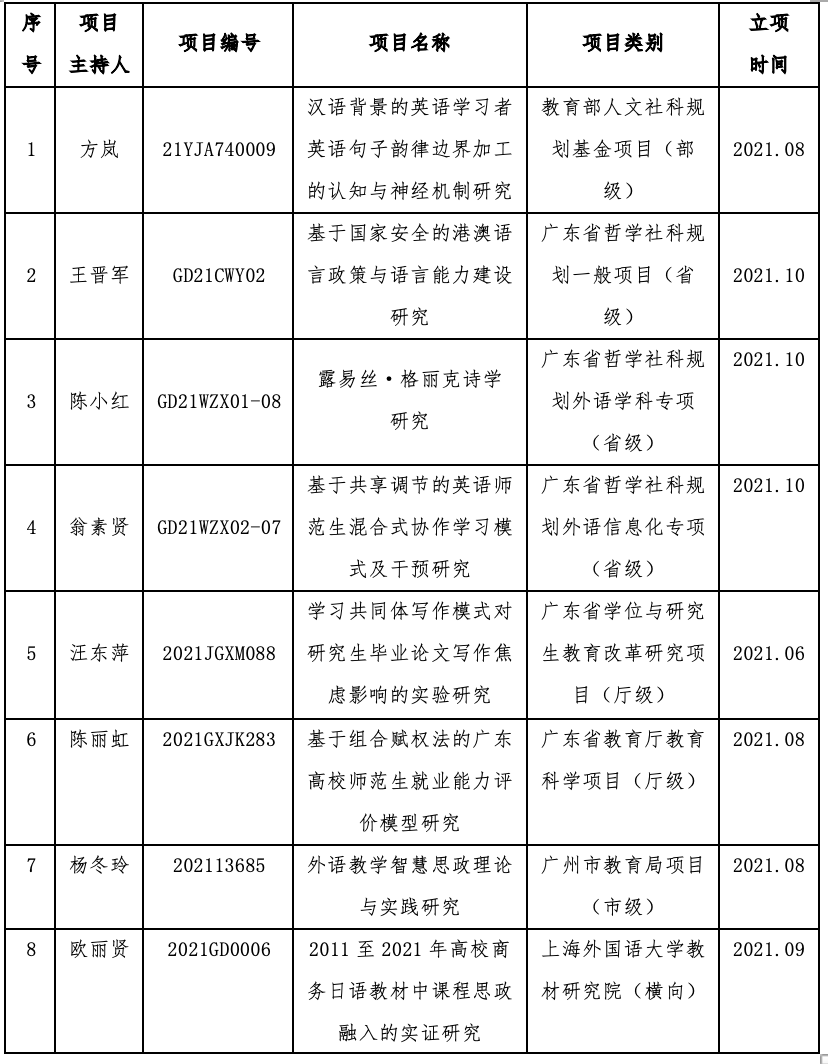 根据科研系统导出的数据,2021-2022学年第一学期我院教师有8个项目立项,其中,方岚博士荣获2021年度教育部项目、王晋军教授荣获广东省哲学社科规划项目、陈小红教授获广东省哲学社科规划外语学科专项项目、翁素贤老师获广东省哲学社科规划外语信息化专项、汪东萍教授荣获2021年广东省学位与研究生教育改革研究项目、陈丽虹副教授获广东省教育厅教育科学项目、杨冬玲副教授获广州市教育局项目、欧丽贤博士承担1项上海外国语大学的横向项目。