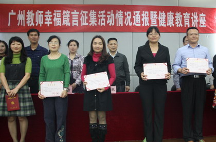 “广州教师幸福箴言”征集评选活动由广州市教育局、市教育工会联合主办,是“幸福校园”系列活动之一。去年4月,校工会在全校范围内广泛开展“幸福箴言”征集评选活动。我院分工会积极发动教职工参与,全校工会将征集的65条幸福箴言组织专家评审后,评选出10条优秀作品推荐参加市评选。在广州市各级教育工会推荐选送的作品有3万多条。这些作品从多角度展示了广州教师的幸福观,展现了新时期广州教师高尚的职业情操。