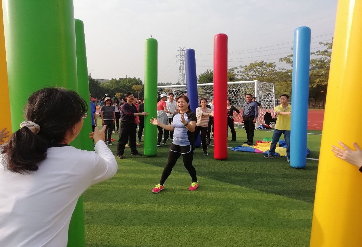 我院教师参加了指压板接力赛、龙行天下、同舟共济、凝心聚力、不倒森林、神来之笔等项目。老师们放下了繁忙的教学工作,一改平日的严肃,在运动中HI起来。老师们争分夺秒练习比赛项目,认真进行热身等赛前准备。参赛老师在各项比赛中个个精神抖擞,运动中散发着青春和活力。整个运动会充满趣味性,又充满了挑战性。老师们在比赛过程中互相加油鼓励,场面十分热闹。当一组老师参加项目比赛时,其他老师们都加油呐喊,并用手机记录下比赛的进程,拍下了一个个精彩的瞬间。