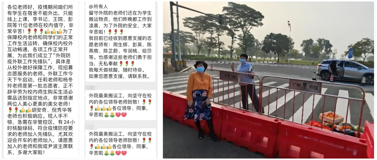 11月9日以来,西瓜视频 的静态管理正牵动着广大师生的心,疫情防控是学校当前工作的重中之重,学院党委书记李暖均、院长王晋军教授带领留校教师、辅导员冲锋在前,24小时坚守在疫情防控第一线,我院在校外教师也用自己的实际行动,接力传递力量,构筑起疫情防控的“钢铁长城”。
