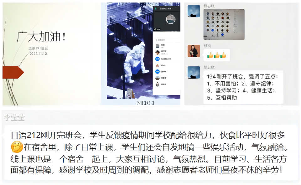 静态管理期间,防控一线工作任务重、强度高、线条多,我院驻校教职工第一时间响应,积极投身一线工作,全力保障在校学生静态管理期间的用餐、学习等需求。校外教职工多措并举,与校内教职工联动协作,确保学院疫情防控各项统计及教学管理服务各项工作有序开展。班主任和专任老师们引导教育同学们科学防护、调试心态、坚定信心。
