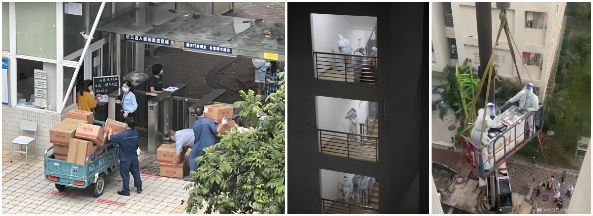 (图3、4、5:我院辅导员和我校教职工驻守学生公寓派送物资)