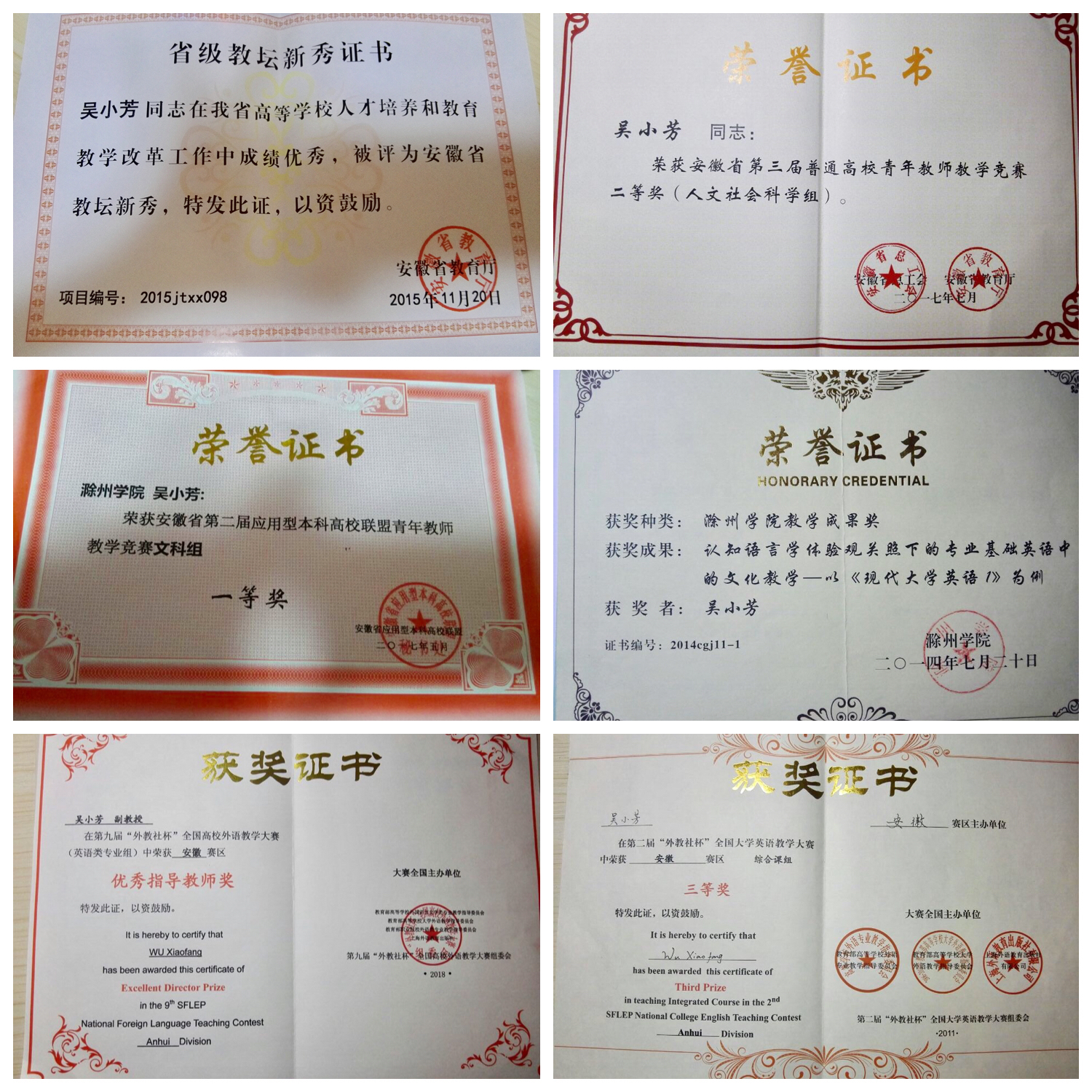 英语专业副教授。吴小芳师姐曾主持和参与多个科研、教研项目,如2015.7-2017.12间,主持安徽省教育厅人文社科重点项目2015A438;在2017.1-2018.12间,参与安徽省教育厅人文社科重点项目sk2017A0422等。吴师姐还在《外语研究》及其他大学学报发表论文多篇,教学获奖多项。