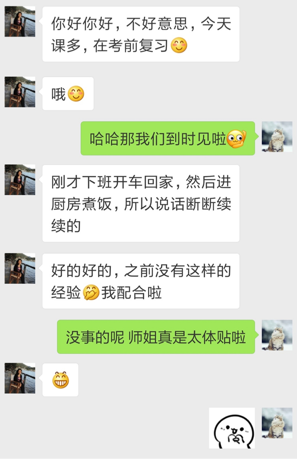 有时候,为了引导学生,师姐会旁推侧引,与学生们分享观点、聊兴趣爱好,从多方面和学生打成一片,同时真心地怜惜爱护学生。比如会与成绩较弱的班级分享小故事、分享自己的经历。学生取得进步,师姐会为他们高兴;学生努力,师姐会很感动。师姐说“我特别尊重努力的学生。我不会偏袒成绩好的学生,更不会看不起成绩不好的学生。我跟他们说,不管怎么样都好,只要你想学、肯学,我一定帮你。”师姐的真情付出,赢得了学生们的信任,学生们待她如知己。采访的第二天,师姐正好和以前的学生有约,谈到那位学生,师姐满脸欢喜:“这位学生是把我当作‘妈妈’的,他会和我分享很多事情,要紧张复习准备考试了、要练车考驾照了;谈恋爱、失恋了都会告诉我。会推荐我看神盾局啊,美剧英剧啊,他说明天回来,又要拷资源给我”。