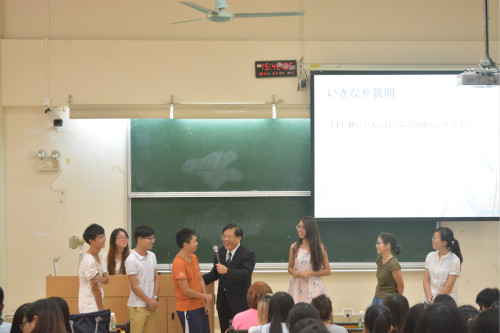 彭飞教授并没有作过多的前言,而是用一些同学们在日语学习中没有遇见过或深入思考过的问题将同学们领入演讲的主题。比如“吴服”一词的动词搭配,单词的音读、训读、促音的发音问题等。这些不仅是日语学习中的同学们较少关注的知识点,也突出表现了中日两国文化差异。彭教授借助诙谐的语言解说,丰富的肢体动作,让同学们不再拘谨,同时也将讲堂气氛推向高潮,讲堂上不时爆发出阵阵笑声。同学们在开怀大笑中收获到了许多知识,思考将来的日语学习方法,希望能不断学习、进步和成长,可谓是一举两得。除此之外,彭教授还为大三、大四年级的同学提出了各种毕业论文的研究命题建议,对于同学们来说也有一定参考价值。
