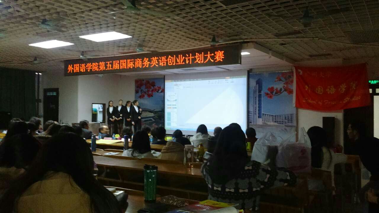 12月17日晚,由我院国际商务英语专业组主办的第五届国际商务英语创业大赛在讲学厅隆重举行,6支队伍各展风采。出席大赛的评委和嘉宾有覃鸿怀副院长,丁怡老师,程跃珍老师,外教Jim Russel,蒋金运主任等;比赛指导老师分别是吴吉松老师、李春景老师、冯时老师、彭欢老师、张敏捷老师。参赛队伍Beyond Tree以最高分胜出,荣获一等奖。