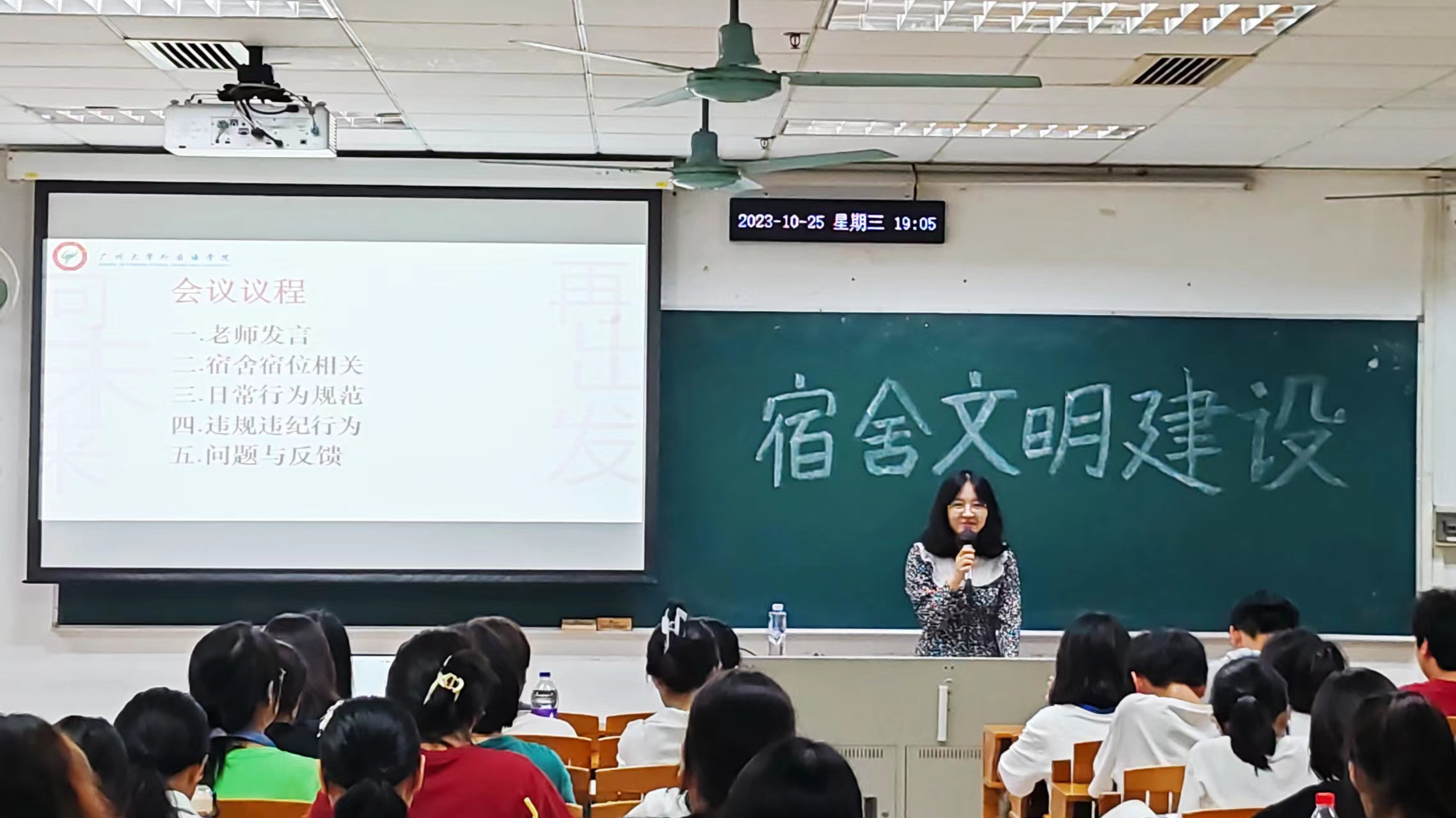 会议开始,2023级辅导员周莹老师围绕“安全、纪律、团结”这三大主题为宿舍建设指明了方向,同时还对近期宿舍走访时发现部分问题一一进行说明并提出解决方案。安全,是宿舍生活之基;纪律,是宿舍生活之本;团结,是宿舍生活之魂。只有遵守宿舍相关的行为规范、筑牢安全之基,同学之间相互尊重、相互理解、将心比心、团结互助,才能营造出良好西瓜视频