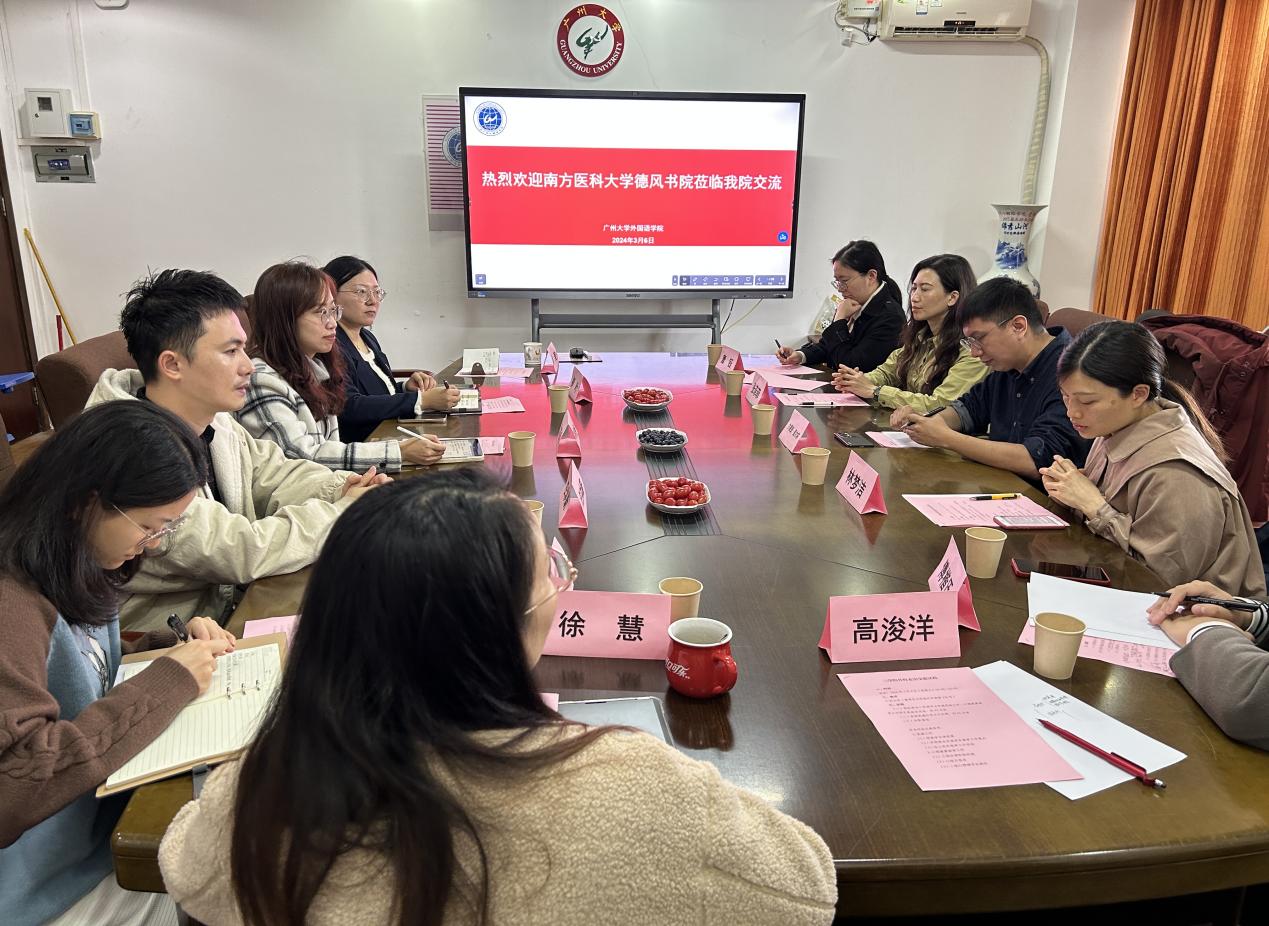 3月6日,南方医科大学德风书院办公室主任尔夏提·图尔荪一行6人莅临我院就学生党建思政工作、心理健康教育等开展座谈交流。学院党委副书记许多恬及辅导员参加了座谈。