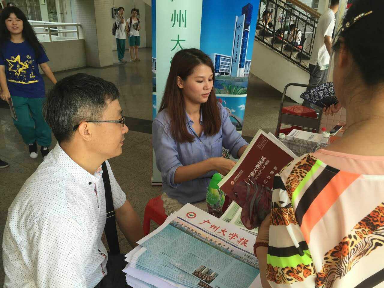 为配合学校的招生宣传工作开展,我院抽调了一批资深骨干专任教师组成了招生宣工作小组,经过多日的培训,6月26日、27日,工作组分成6个小组,在学院领导的带领下,分赴广东实验中学、广雅中学、协和中学、广州市第一中学、第二中学、第十六中学进行招生宣传,向考生及考生家长宣传我校的招生政策,以及学校的优势学科,并现场解答考生及考生家长的问题。工作组在各中学都受到了考生和考生家长的热烈欢迎,充分体现出学校近几年社会声誉度的大幅提高。