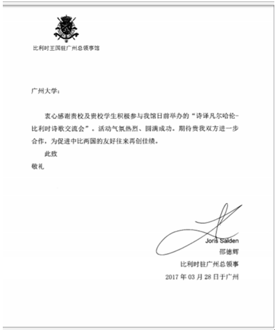比赛结束之后,比利时驻广州总领事绍德辉先生还专程寄来了感谢信,感谢我校对此次活动的支持,并期待进一步的合作。
