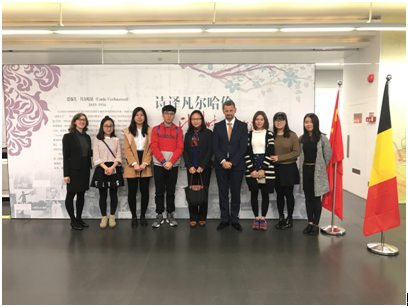 比利时驻广州总领事绍德辉先生与外语西语系主任邹琰副教授、法语专业获奖学生合影
