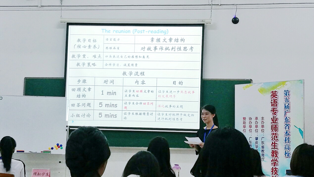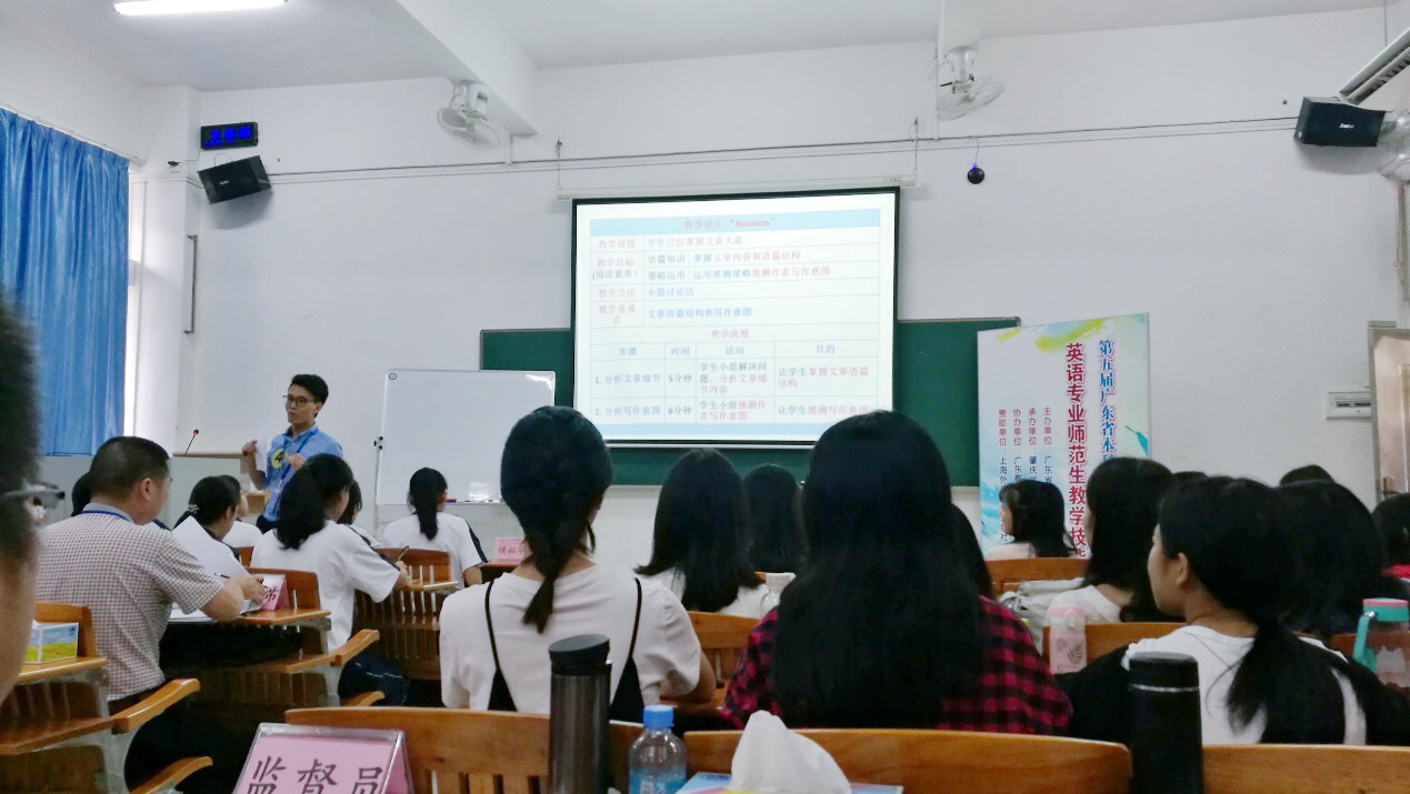 10月14日,第五届广东省本科高校英语专业师范生教学技能大赛决赛在肇庆学院举行。我院在院赛、校赛的基础上选拔学生参加省赛,14级袁培元和凌桂珊同学最终进入决赛,与来自全省15个高校的二十多名同学同台竞技。