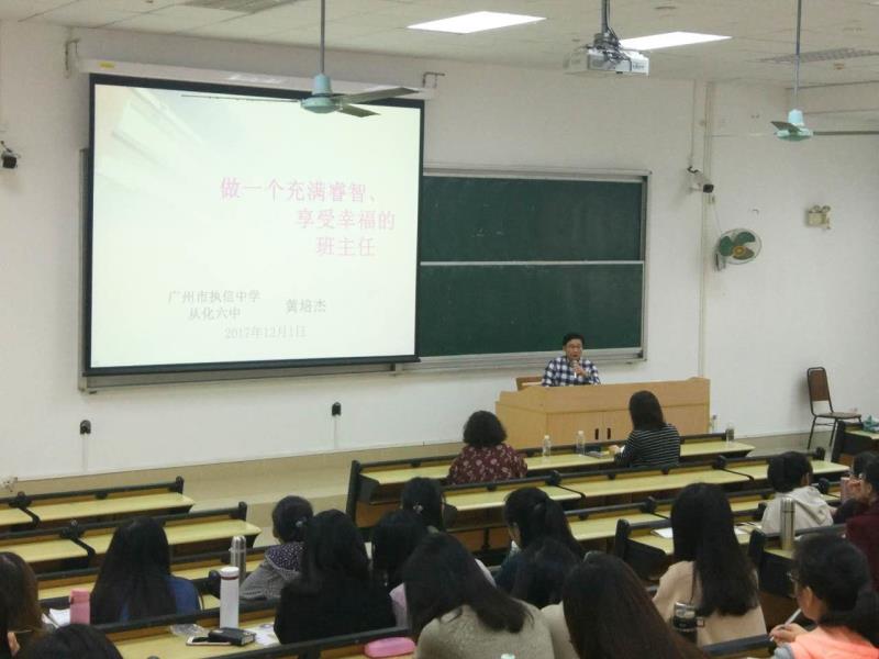 黄校长的讲座题目是“做一名充满睿智、享受幸福的班主任”。他通过大量的案例、故事和同学们分享了如何当一名睿智又幸福的班主任的心得体会。黄校长告诫同学们要勇于承担班主任工作,说道:“如果你只当老师,而不做班主任,那你的教学生涯会不完整。”