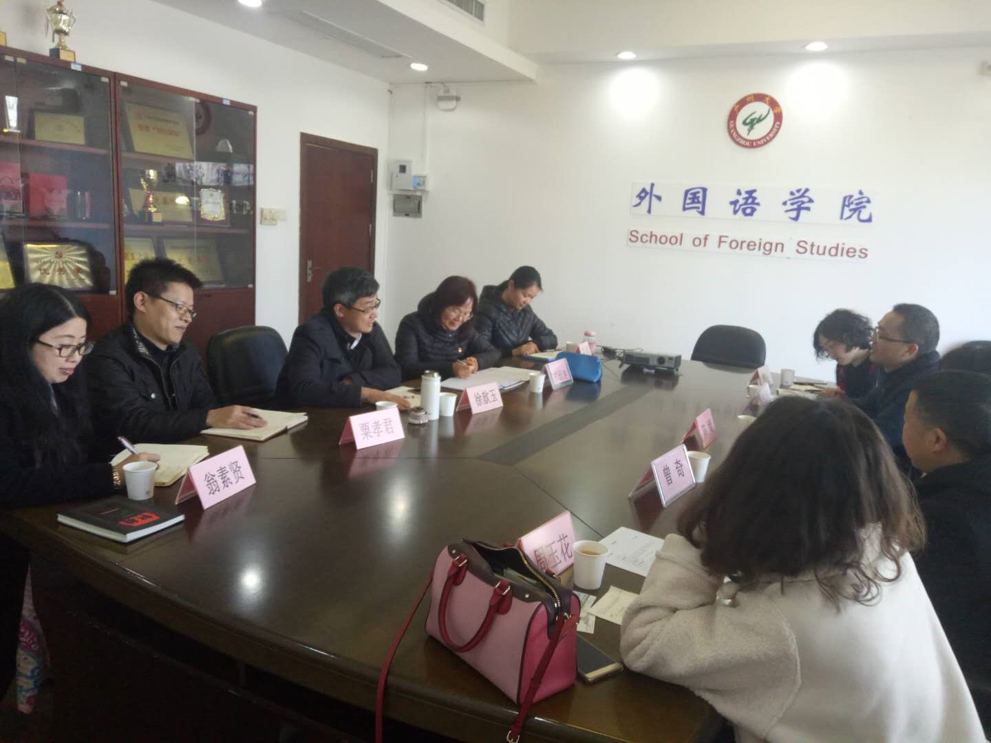 领导、老师们的到来表示热烈欢迎,并介绍了学院的基本情况。接着,苏远连副院长介绍了我院英语和日语专业的人才培养方案及办学特色;徐歆玉副院长也介绍了我院大学英语部的教学情况,尤其是拓展课等特色课程的设置。随后,双方针对人才培养方案的修订以及外语专业学生的实践情况等进行了充分的交流,交换了彼此的一些好做法。