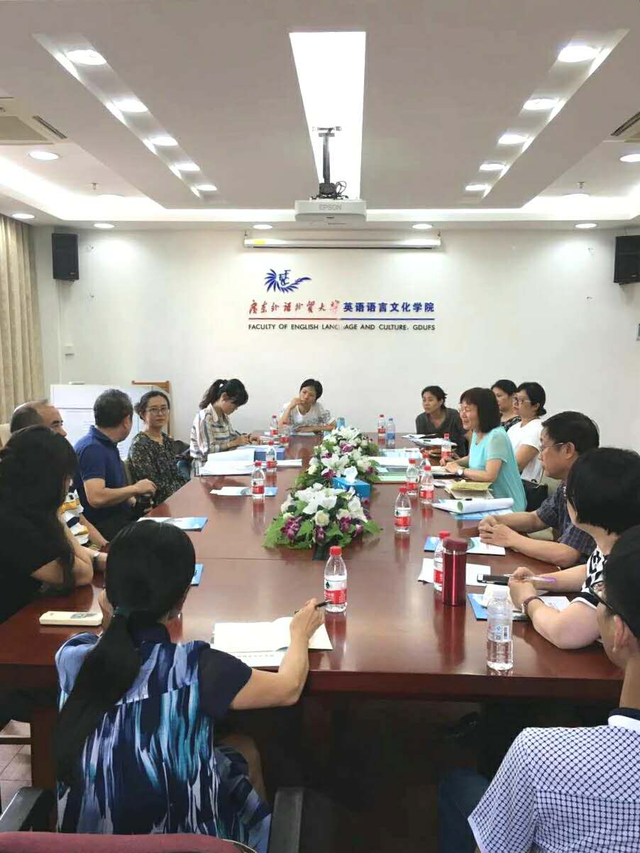 2017年6月30日下午,我院苏远连副院长带队我院教师一行11人前往广东外语外贸大学英文学院进行调研,与主管本科教学的副院长姜琳教授、博士生导师何晓伟教授、文化系主任彭保良教授以及CECL课程主讲郭晓涛老师等在北区第7教学楼412室进行了热烈而充分的交流和探讨。