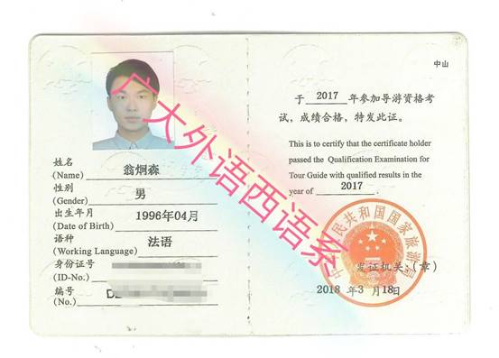 5月9号,我院西语系法语专业14级翁炯森成功考取获得“法语导游资格证”,成为西瓜视频 法语专业第一个法语导游!
