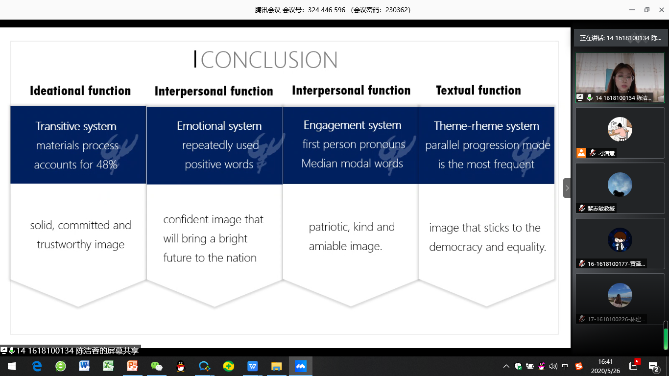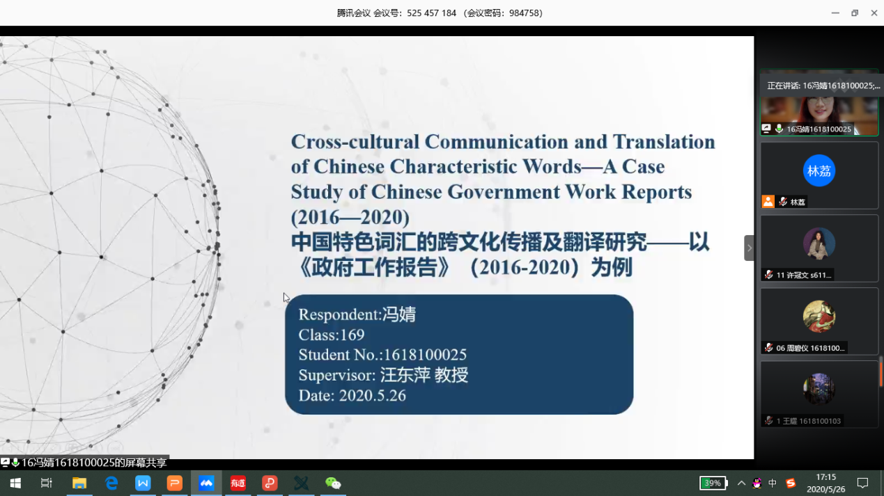 2020年5月26日下午,我系2020届本科生毕业论文全面答辩通过线上平台顺利进行。本年度共有英语专业、英语(二专)专业352位学生参加了本次线上全面答辩。网络答辩共分为18个小组,答辩过程跟线下答辩保持一致。为确保顺利开展本次线上答辩,英语系在西瓜视频
