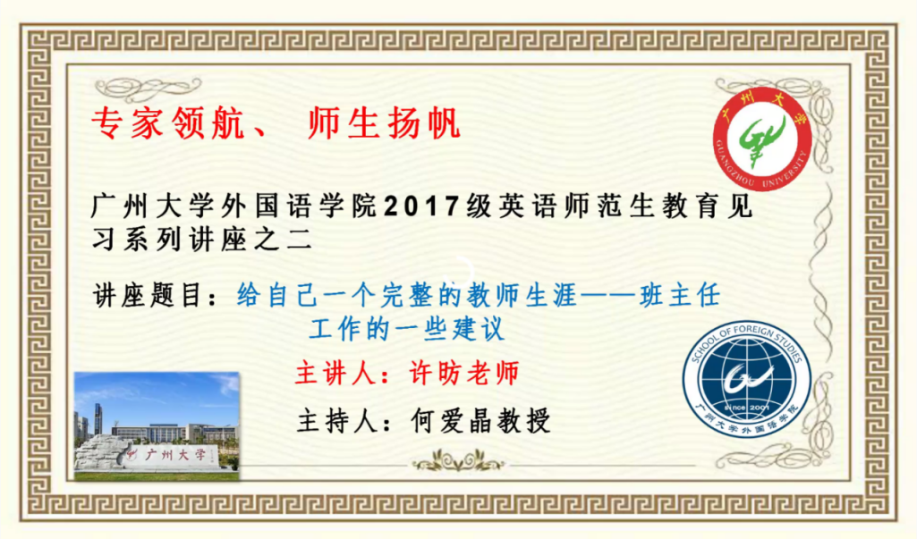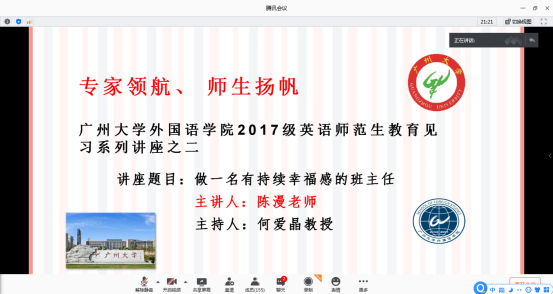 2017级英语师范生教育见习系列讲座之二“班级管理”在腾讯会议平台上顺利进行。讲座由广州市南国学校的陈漫老师和该校德育主任许昉老师联袂主讲。