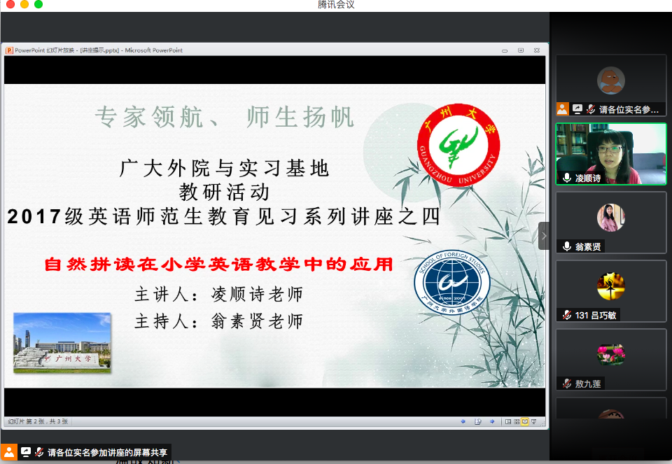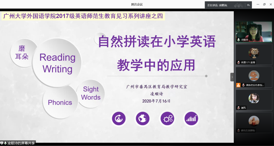7月16日下午14:30,广州市番禺区教育局教学研究室小学英语教研员凌顺诗老师带来了一场题为“自然拼读在小学英语教学中的应用”的讲座。该讲座是我院2017级英语师范生教育见习系列讲座的第四场讲座,也是2020年“专业领航、师生扬帆”广大外院与实习基地教研系列活动的第四场活动。此次讲座由英语师范教研室主任翁素贤老师主持,17级全体师范生、我院教育实践基地一线教师代表和部分毕业校友、在校同学共两百多人在腾讯会议参加了本次活动。