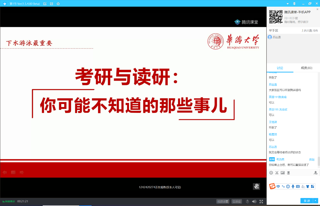 院长毛浩然教授应邀为我院师生讲授“考研与读研——你可能不知道的那些事儿(兼谈科研小白快速入门学术殿堂的事半功倍之道)”。本次讲座由我院副院长苏远连教授主持,英语专业创新班全体同学等80多人在腾讯课堂上参与了本次讲座。