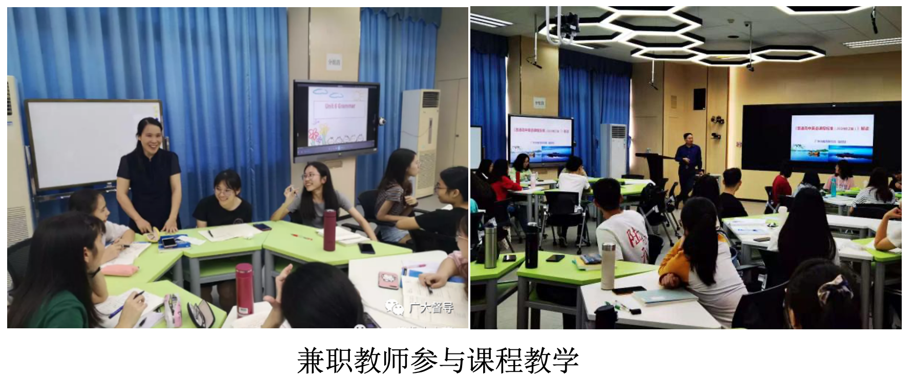 本专业已形成一支综合素质高、业务精湛的专业教师队伍,有语言学、文学、文化、教育等专业背景的专任教师45名,外籍教师5名;其中教授11名,博士及在读博士21名,教师中拥有广东省本科高校教指委副主任委员1名、委员1名,是广东省外国文学研究会会长单位、广东外国语言学学会、广东翻译协会、广东省外语教育评价学会副会长单位。本专业聘用30多位校外兼职教师,他们分别来自基础教育单位、政府机构、企业或本院大学生实践基地。