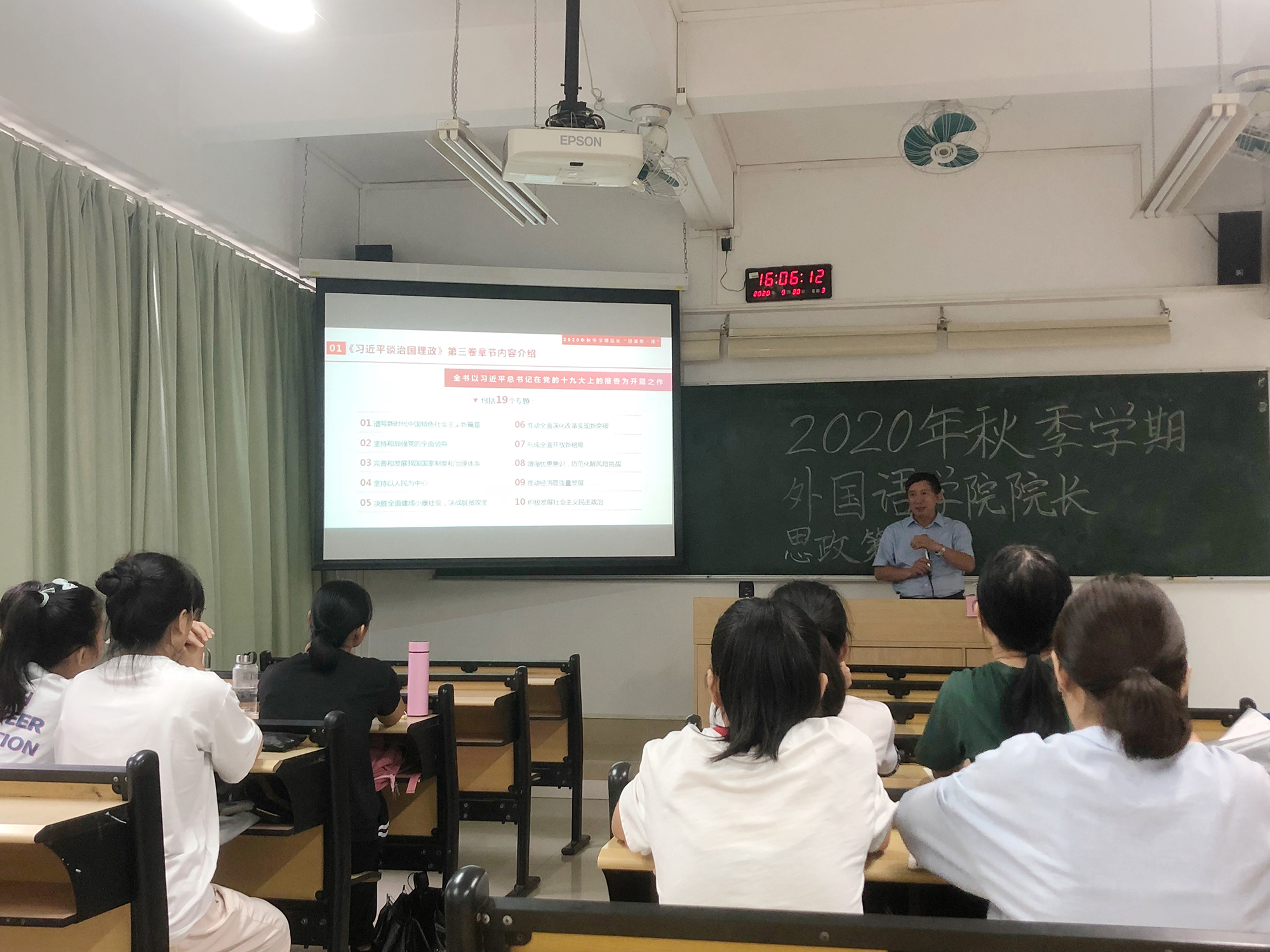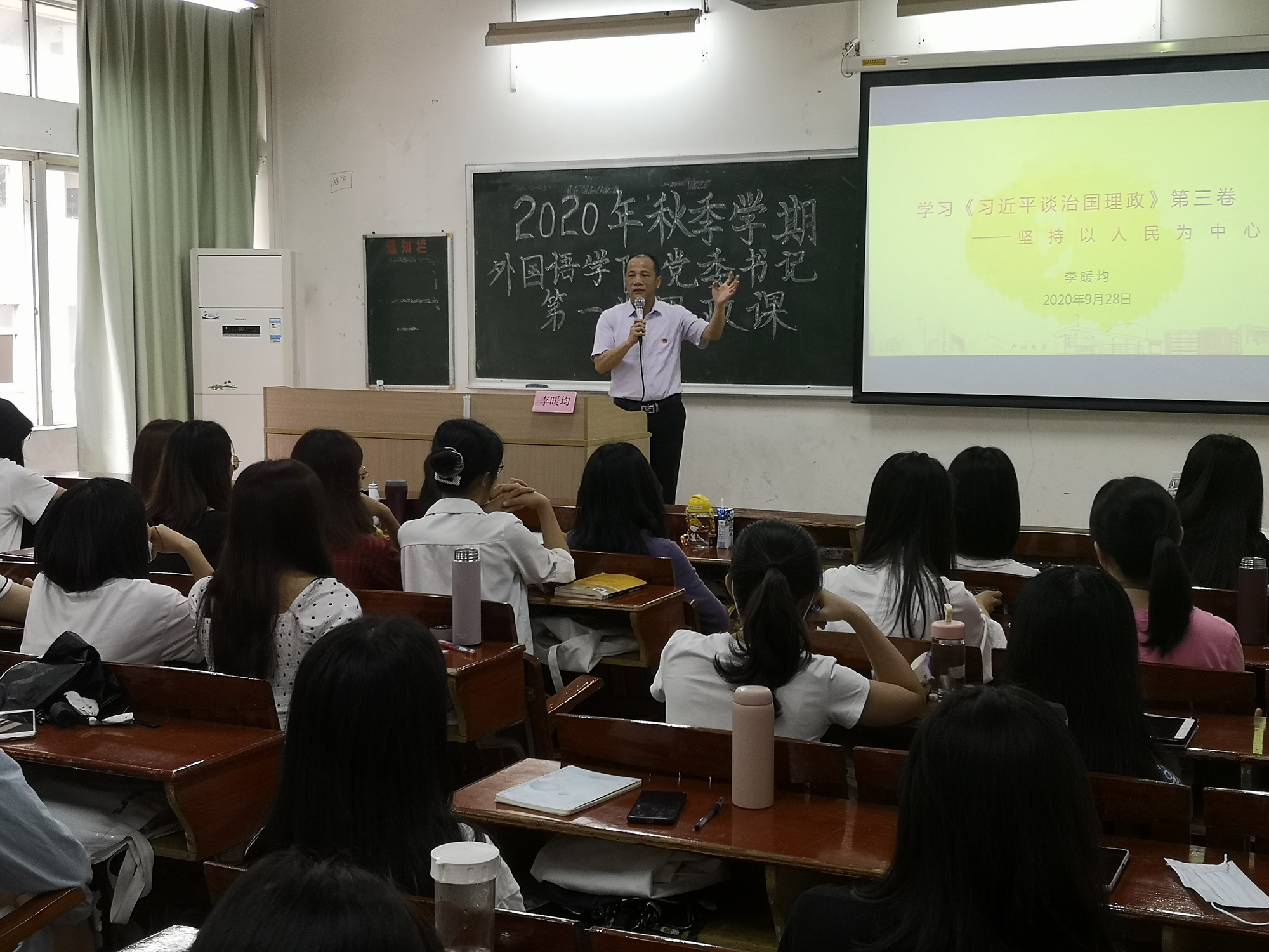 9月28日上午,我院党委书记李暖均以“学习《习近平谈治国理政》第三卷——坚持以人民为中心”为题在桂花岗校区为59名新入学的2020级学科教学(英语)专业研究生上思政第一课。李书记介绍了《习近平谈治国理政》第三卷的基本内容,重点强调了习近平总书记在纪念朱德同志130年周年座谈会上提到的战略思维、历史思维、辩证思维、创新思维、法治思维、底线思维,并结合当下的时政热点,突出了中国“坚持以人民为中心”的治国理政思想。李书记用习近平在全国抗击新冠肺炎疫情表彰大会上的讲话,对那些为保护人民生命安全的“人民英雄”致以最诚挚的敬意,并寄希望同学们能够像他们那样,勇于挑起时代的重任,不负韶华。