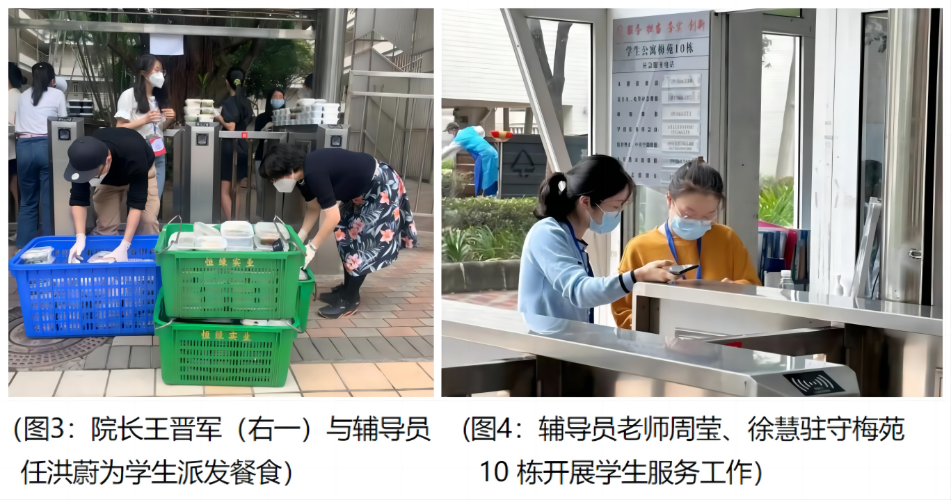 11月9日我校大学城校区启动疫情防控应急响应机制以来,我院积极配合学校各项工作部署,组织全体教职工线上线下多渠道落实学生餐食派送、急需物资运送、送医配药,开展思想教育引领、情绪疏导关怀、核酸检测、重点人员服务管理、外联支援等各项工作,切实保障校园师生安全健康。