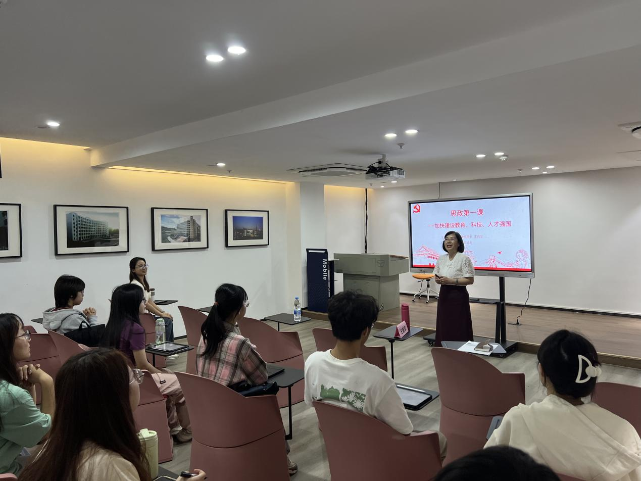 “思政第一课”环节中,王晋军院长与大家深入探讨了加快教育、科技、人才强国的重要性。王院长指出加快建设教育、科技和人才强国是铸就强国建设的坚实基础讲述如何建设“教育强国”、“科技强国”和“人才强国”,强调科技是动力源和关键,教育是根本、人才是基础指明要实现建设教育、科技与人才强国,最根本的是必须坚持中国共产党的领导,同时需充分发挥高校带领作用,希望同学们发挥好专业优势,用外语讲好中国故事,服务社会与国家。