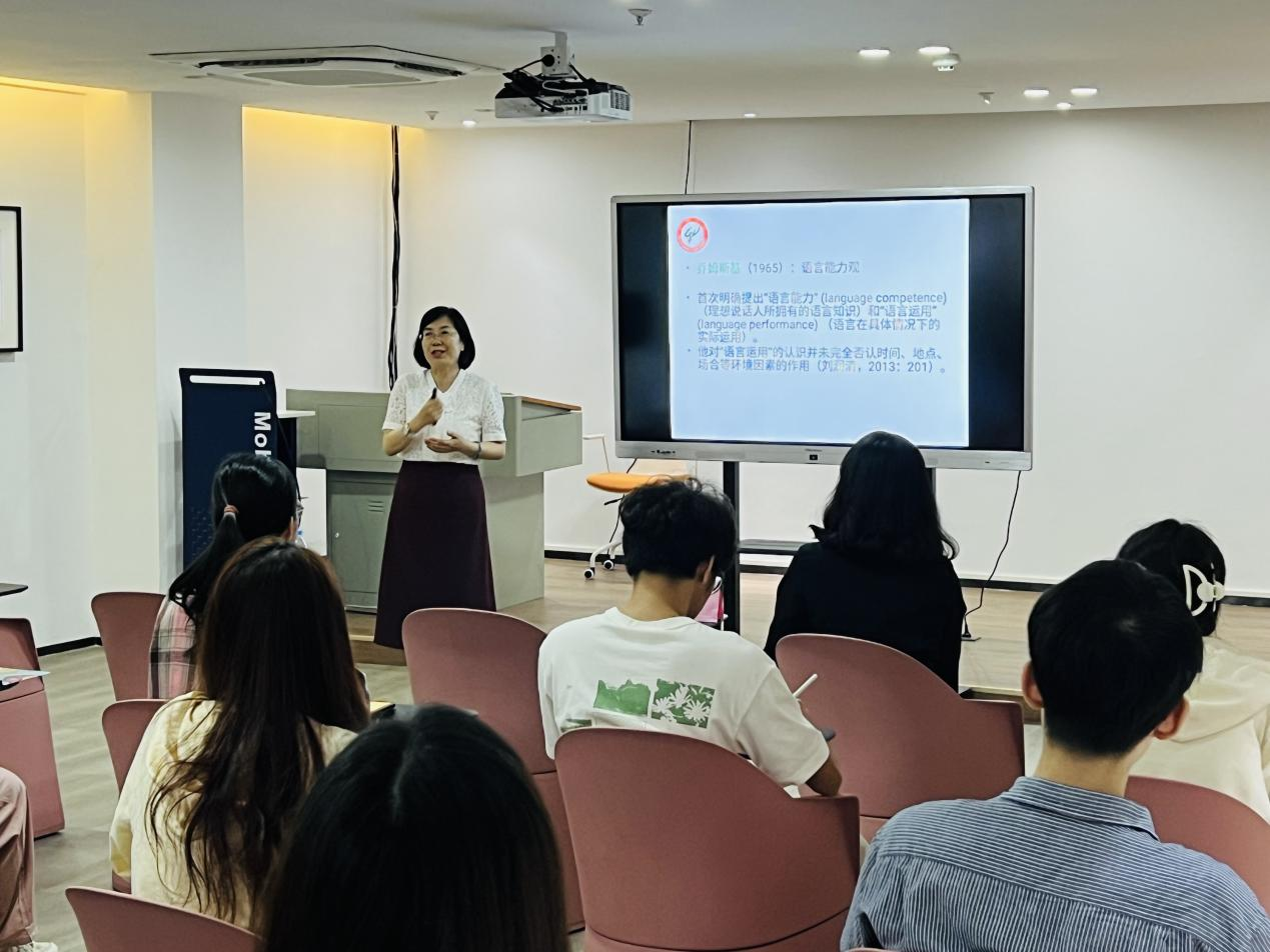 “生态语言学视域下的语言能力研究”主题讲座中,王院长结合多位学者的观点从定义多视角研究对语言能力研究进行阐释,强调生态语言学领域下的语言能力既关注内涵,又关注实现手段。随后,就生态语言学领域下的语言能力解读进行深入的探讨,结合其在云南独龙族地区的调研和学者豪根的观点,指出生态领域下的语言能力研究关注语言语言使用者与环境的相互关系——通过研究语言在不同环境中的运用和变化,可以更好地理解语言的本质和功能,为语言能力的培养提供科学依据。院长结合我国国情,阐述了党和国家对语言能力的重视及取得的成就,希望同学们发挥专业特长,运用经典和跨学科研究方法,衔接国家需求开展科学研究,致力提高社会公众的语言能力。
