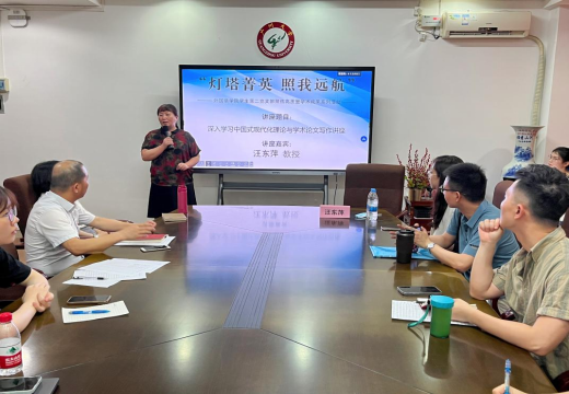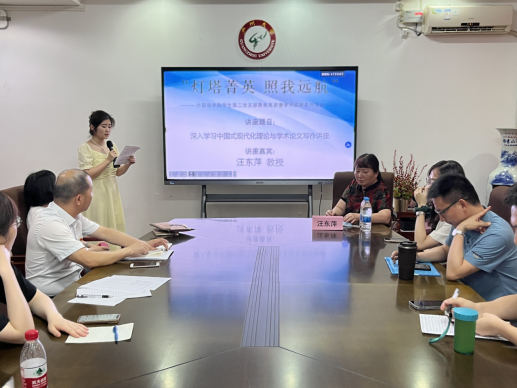 党委集中研讨读书班专题辅导报告会暨学生第二党支部“灯塔菁英 照我远航”聚焦高质量学术成果系列活动(第2期)在行政东楼前座333会议室举行。活动邀请我院副院长汪东萍教授作了“深入学习中国式现代化理论与学术论文写作研讨”主题报告。学院党委书记李暖均、院长王晋军、副院长彭念凡、副书记许多恬、支部书记任洪蔚及部分研究生、本科生参加了本次活动。