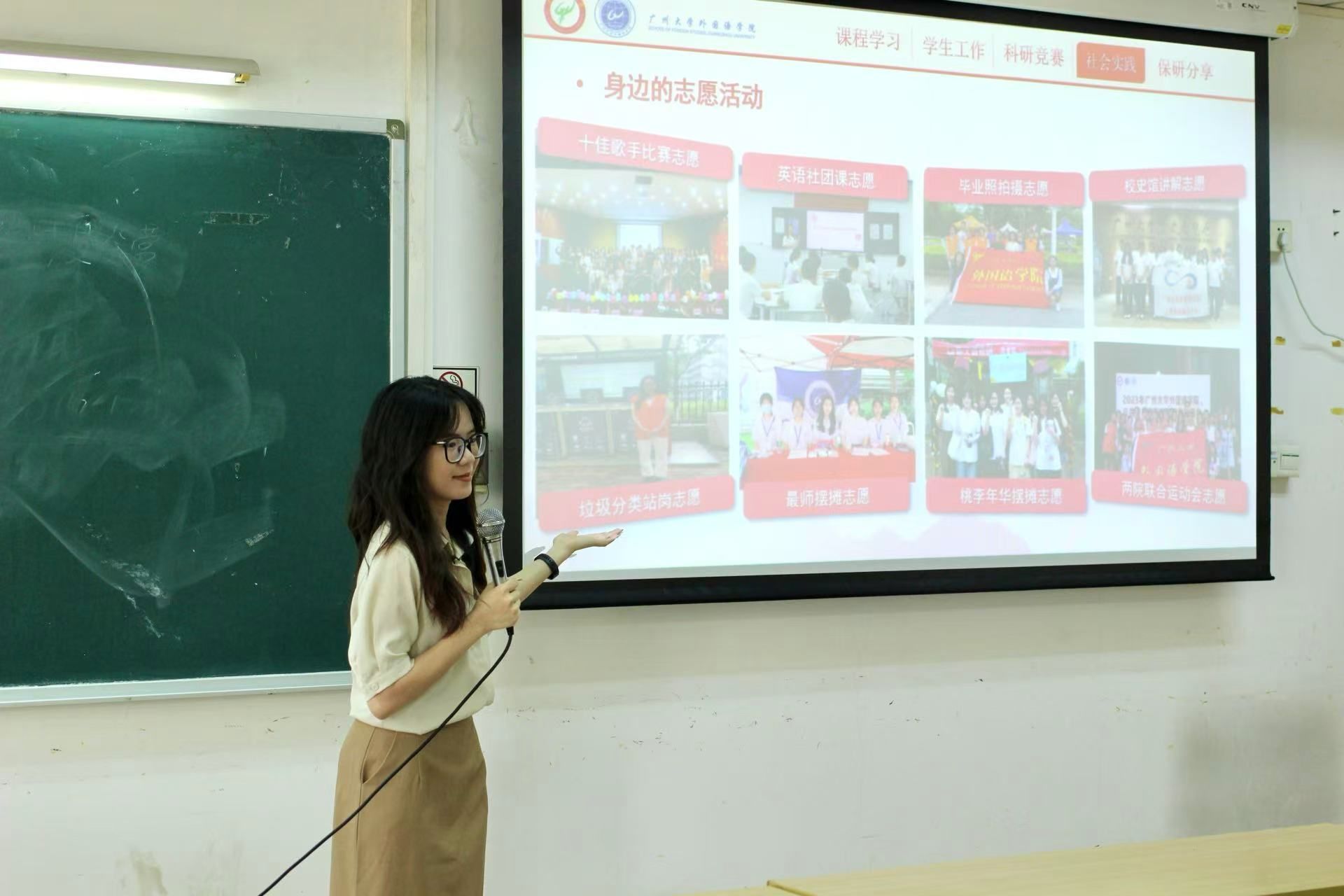 首先,党员陈慧冰同志以“投身社会实践,绽放青春光彩”为主题,为同学们带来了一场生动详实的分享。她开场便分享自己的经历:“过去四年里,我参与过社区公益课堂、乡村支教、广交会志愿服务等多项志愿活动,累计服务时长超684小时。”这些丰富的实践经历,成为她本次讲座的宝贵素材。谈及为什么要做社会实践,她认为,大学生不应局限于书本,而应通过实践了解社会需求,培养自身综合能力。在做社会实践的规划方面,她强调“目标导向,分步落实”。对于如何找到志愿活动,陈慧冰同志分享了多种渠道。她推荐关注校院青协、志愿者协会的官方公众号和网站,这些平台会定期发布各类志愿活动信息;鼓励同学们加入学校的志愿社团,通过社团组织参与实践;此外,还可以主动联系社区、公益机构,毛遂自荐争取服务机会。她建议同学们在大一大二时多参加志愿活动,不仅能锻炼沟通协调、问题解决等能力,更重要的是,在帮助他人的过程中收获成就感,增强社会责任感。最后,陈慧冰同志重点分享了自己参加广交会志愿服务的经历。在广交会上,她凭借外语专业优势,担任外宾接待与翻译工作。面对来自不同国家的客商,她不仅要准确翻译,还要协调展品对接、解答客商疑问。这段经历让她深刻体会到,社会实践不仅是服务他人,更是自我成长的宝贵契机,激励着同学们积极投身社会实践。