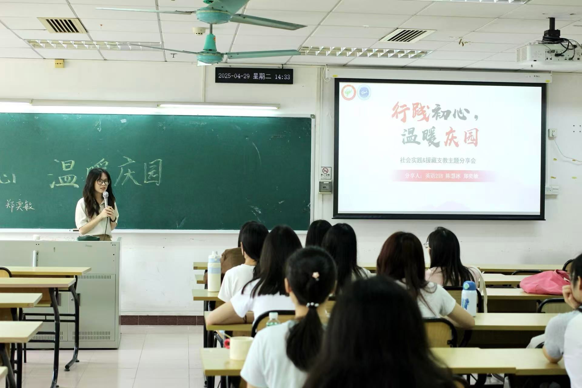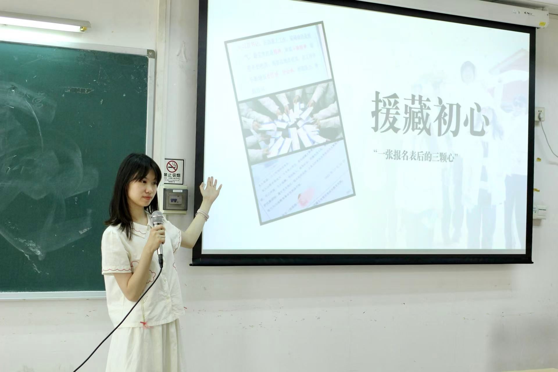 郑奕敏同志结合自身的援藏支教经历,为同学们带来了以“在离天空最近的地方种星光”为主题的分享。分享伊始,郑奕敏同志用“一张报名表后的三颗心”——责任心、好奇心、冒险心,带我们走进了她援藏的初心世界。在选拔面试时,当被问及支教缘由,她坚定地说:“作为一名预备党员,我有责任到祖国需要的地方去。”这份责任,是她踏上支教之路的基石。其次,在支教工作与生活的讲述中,郑奕敏同志用一个个生动有趣的事例,让我们身临其境。她分享了自己是如何在实践中寻找最适合学生的教学方法,从初出茅庐的青涩,到逐渐掌握课堂管理技能的经历。丰富的图片和与学生之间的小故事,更是将支教过程中的“甜与苦”展现得淋漓尽致。她说:“支教的过程是甜蜜与挑战相伴的,虽然这个过程很辛苦,但是每当看到学生的笑脸时,一切都值得”。在分享的尾声,郑奕敏同志讲述了自己带回来的“高原礼物”——感悟与收获。她用三句话总结了这段经历:“道阻且长,行则将至”,让我们明白,只要坚定信念,勇往直前,许多困难会迎刃而解;“我们就像是孩子们的眼睛”,提醒我们肩负着为孩子们打开视野、引领未来的重任;“不啻微茫,造炬成阳”,鼓励我们每个人都能成为一点微光,凝聚起来,就能照亮一方天地。她感慨地说,援藏支教是一个互相治愈的过程。支教队员们在离天空最近的地方种星星,而学生们也在不经意间点亮了他们心中的光。最后,郑奕敏同志呼吁大家积极参与投身于为人民服务的社会实践中,青春接力,共赴使命,让自己的大学生活更加丰满,更加有意义。