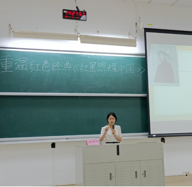 讲座中,倪老师向同学们介绍了作者埃德加•斯诺和《红星照耀中国》这本书的出版史,围绕“一群人”、“一个时代”、“一次长征”、“一种信念”对《红星照耀中国》进行解读。1936年,斯诺陕甘宁边区采访4个月,历经一年将所见所闻写就《红星照耀中国》,第一次向全世界展示“红色中国”、“红军长征”和中国共产党的真实情况,揭示了中国革命和抗日战争的未来希望所在。1937年10月《红星照耀中国》问世后,在当时中共地下党员和爱国民主人士艰辛努力下,以《西行漫记》为名在国内出版首个中译本,影响了更多中国人“发现自己”,促使众多进步青年看到抗日希望,投身革命洪流。“红星照耀中国”,甚至还照耀世界,这本书后又由英文译成法、德、俄、意、西、葡、日、荷、蒙古、瑞典、印地、哈萨克、朝鲜、希伯来、塞尔维亚等近二十种文字,至今畅销不衰。