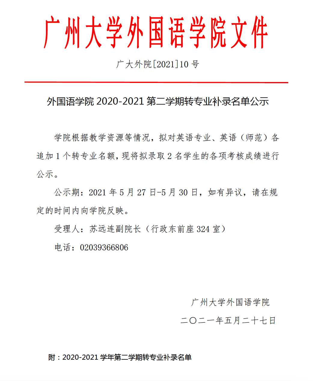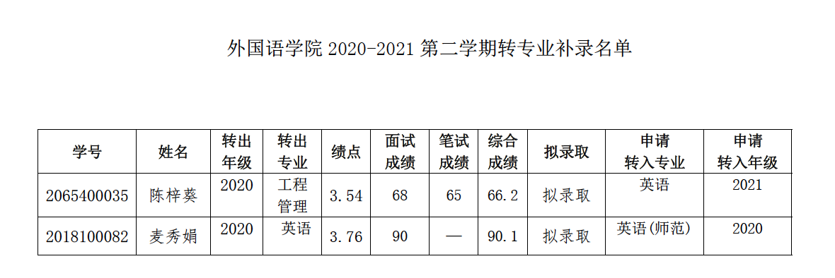 西瓜视频 2020-2021 第二学期转专业补录名单公示