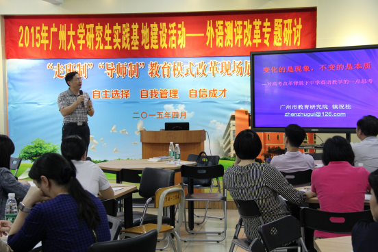 首场学术活动“外语测评改革专题研讨会”针对广东英语高考改革展开,华南师范大学黄丽燕教授和广州市教育研究院资深教研员镇祝桂从不同的角度与层面,就如何应对高考的改革及高中英语教学的走向和趋势,做了精彩的阐述。两位专家给了与会者以专业的指导,开阔了他们的教育视野,明确了高考备考的方向,加深了其对核心素养的理解,深刻领悟越秀外国语“走班制”改革的真正内涵。两位专家充分肯定了越秀外国语学校“走班制”背景下学生“自主选择、自我管理、自信成才”的教育理念,并就如何分层及评价分层提了很多宝贵的意见和建议。