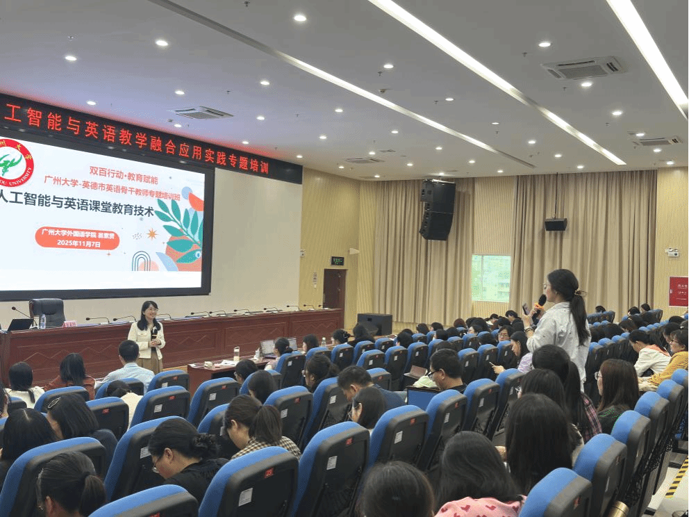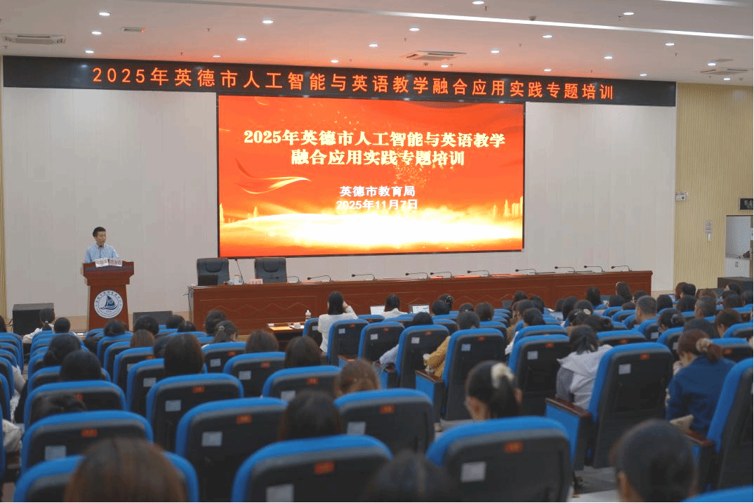 翁素贤老师赴英德市开展“人工智能与英语课堂教育技术”专题培训。此次活动是“双百行动”教育帮扶的重要举措,也是英德市推进“基础教育教师能力提升工程”的重要内容,旨在帮助中小学英语教师破解AI教学应用难题。英德市近300名中小学英语骨干教师参与,现场互动积极。