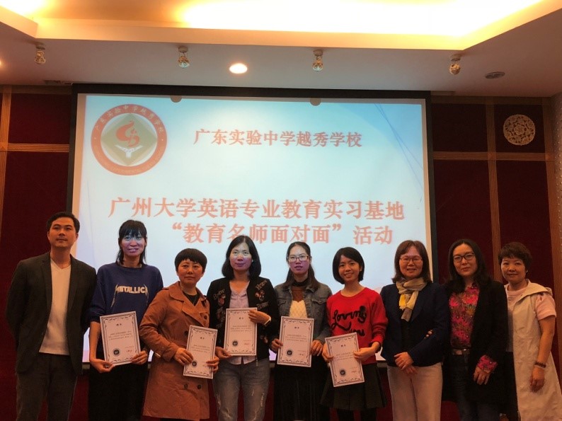11月27日下午,我院英语系教师教育实践基地广东实验中学越秀学校(省实越秀)举办“教育名师面对面”活动。本次活动借助我院英语(教师教育)专业25名大三学生在该校见习之机,邀请到广州市教育研究院教研员何琳老师在盘福校区礼堂里为该校英语科组教师以及25名见习生开展学术讲座和交流活动。省实越秀陈浩杰副校长、我院副院长苏远连教授和英语系倪秀华副教授参加了该活动。