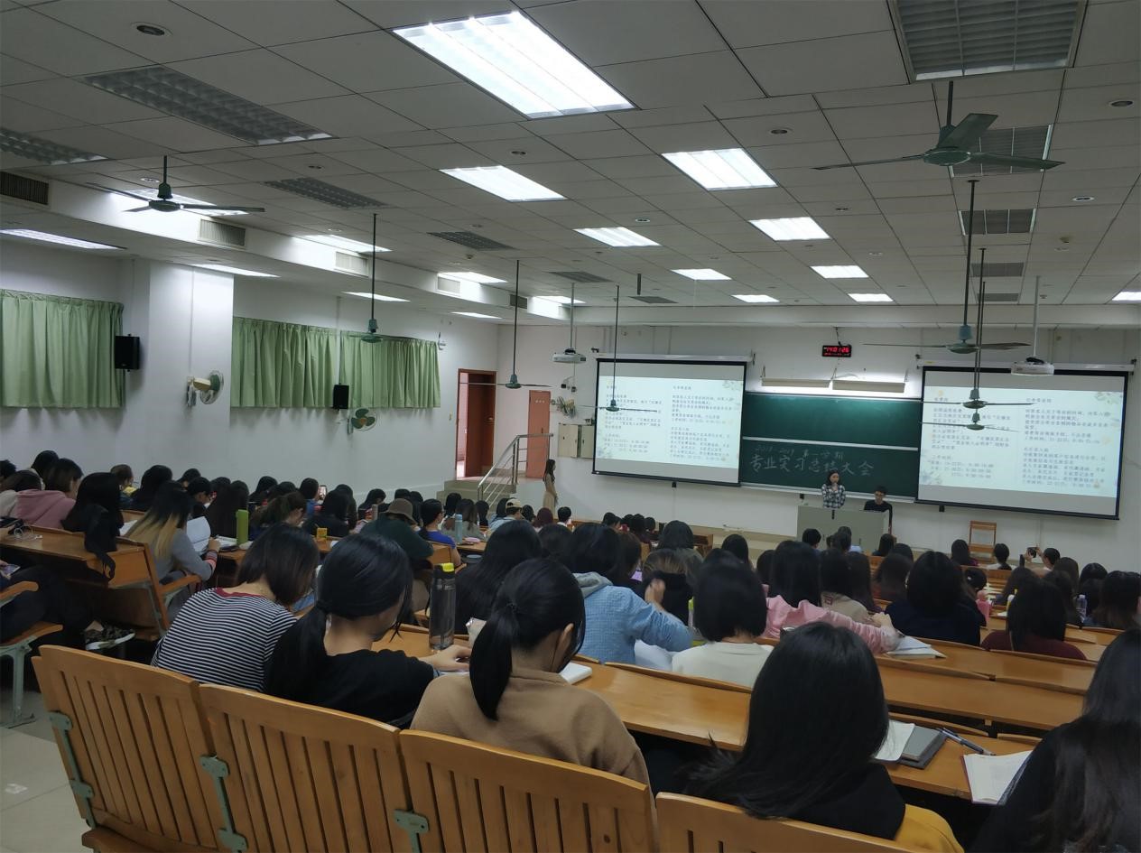 11月27日下午13:50-16:00,英语(翻译)154、155班,英语(国际商务)156、157、158和159班学生在结束了为期4周的专业实习后,在文新413召开了实习总结会,对实习期间的收获和感悟进行总结汇报。英语系副主任陈丽虹,英语(翻译)实习指导教师蒋晓萍、温静、蒋金运,英语(国际商务)实习指导教师汪东萍、程跃珍、陈荷荣、张科荣、李春景、彭欢、吴吉松和曾超参加了会议。