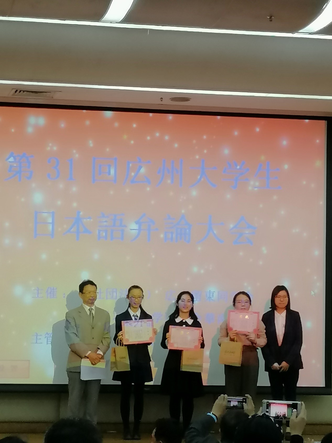 在来自中山大学、广东外语外贸大学、暨南大学等10所公立大学的23位参赛选手中,经过激烈的日语演讲角逐,我系日语171班郑吴姝同学以总分91.67高分排名第一,荣获特等奖。作为奖品,郑吴姝同学将获得由日本赞助商提供免费前往日本游学一周的学习机会。比赛中,郑吴姝同学以简洁大方的妆容出现在大家视线中,她以清晰流利的日语,抑扬顿挫的语音语调,为大家讲述了自身在异文化交流中频频出现的趣事。那丰富幽默的身体语言,也让观众和评委倍感有趣。在即兴环节中,对于评委的“食在广州”难题,她从容自信,有条有理的向大家介绍广州的早茶文化。最终在评委的一致认同中,取得最优异的成绩。